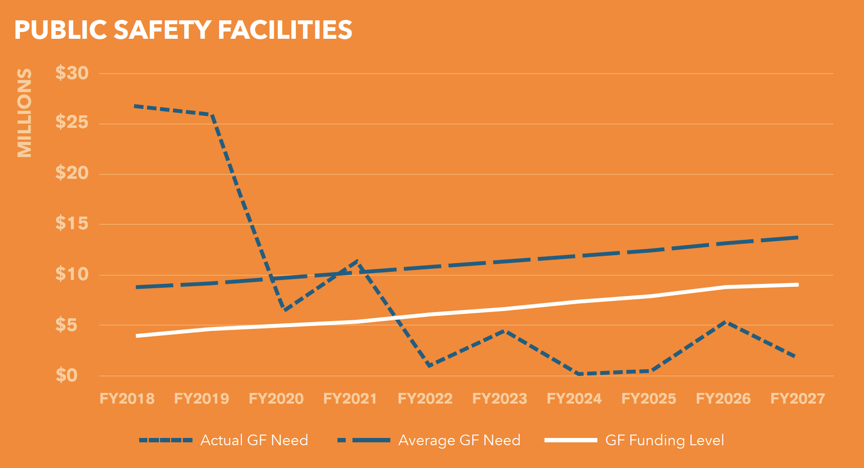 The overall renewal needs for the City’s Public Safety facilities total $227 million over the next 10 years. Given funding constraints, the Plan allocates $69 million from the General Fund to meet these needs, as shown in Chart 10.1. Additional funding from the ESER G.O. Bond Program will also be invested in Fire and Police Department renewals.
